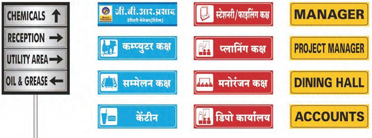 Also known as public information signs which includes Name Plate, Designation, Café, Parking, Restaurant, Fire Extinguishers, No Smoking etc.