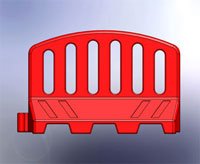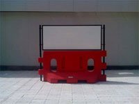 DESCRIPTION : One piece molded Metro Barrier made from superior grades of UV stabilized polyethylene materials with 2 way entry type base compatible with and provided with corrugated ribs at bottom.The one side to be plain surface for proper display .The other side to be with a vertical rib,built-in oval shape ribs for strength and plain space in two parts for display at the center.The slant portion at bottom to be provided with arrangement for filling & drain of water or sand.The overall size : 2000 mm ( L) x 450 mm (W) x 2000 mm (H) with usual process variation.
